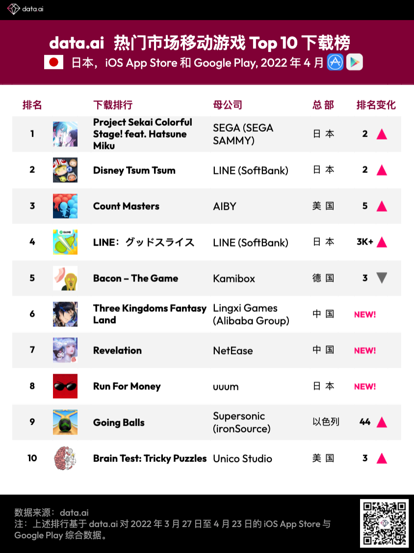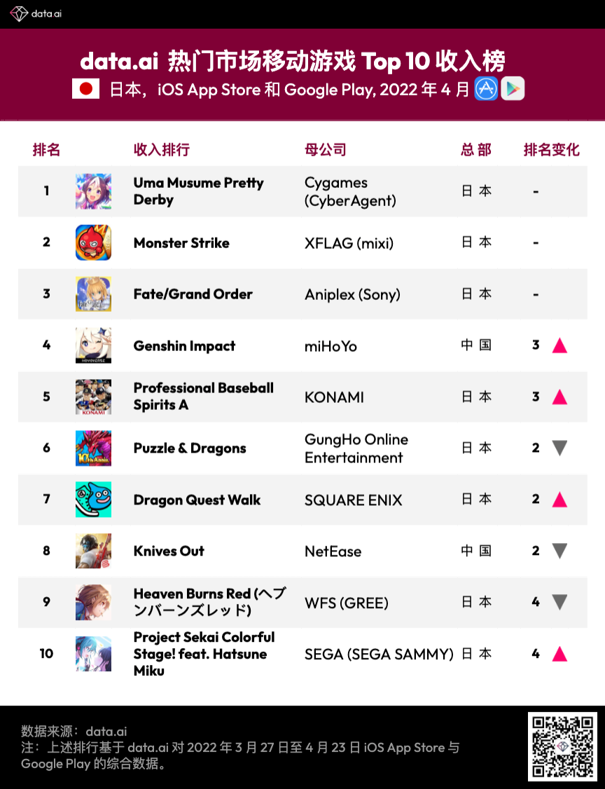 偶像练习模仿游戏《Uma Musume Pretty Derby》稳坐 4 月日本商场收入排行第一,《Project Sekai Colorful Stage! feat. Hatsune Miku》前进 Top 10,证明了该类游戏在日本商场的变现潜力。