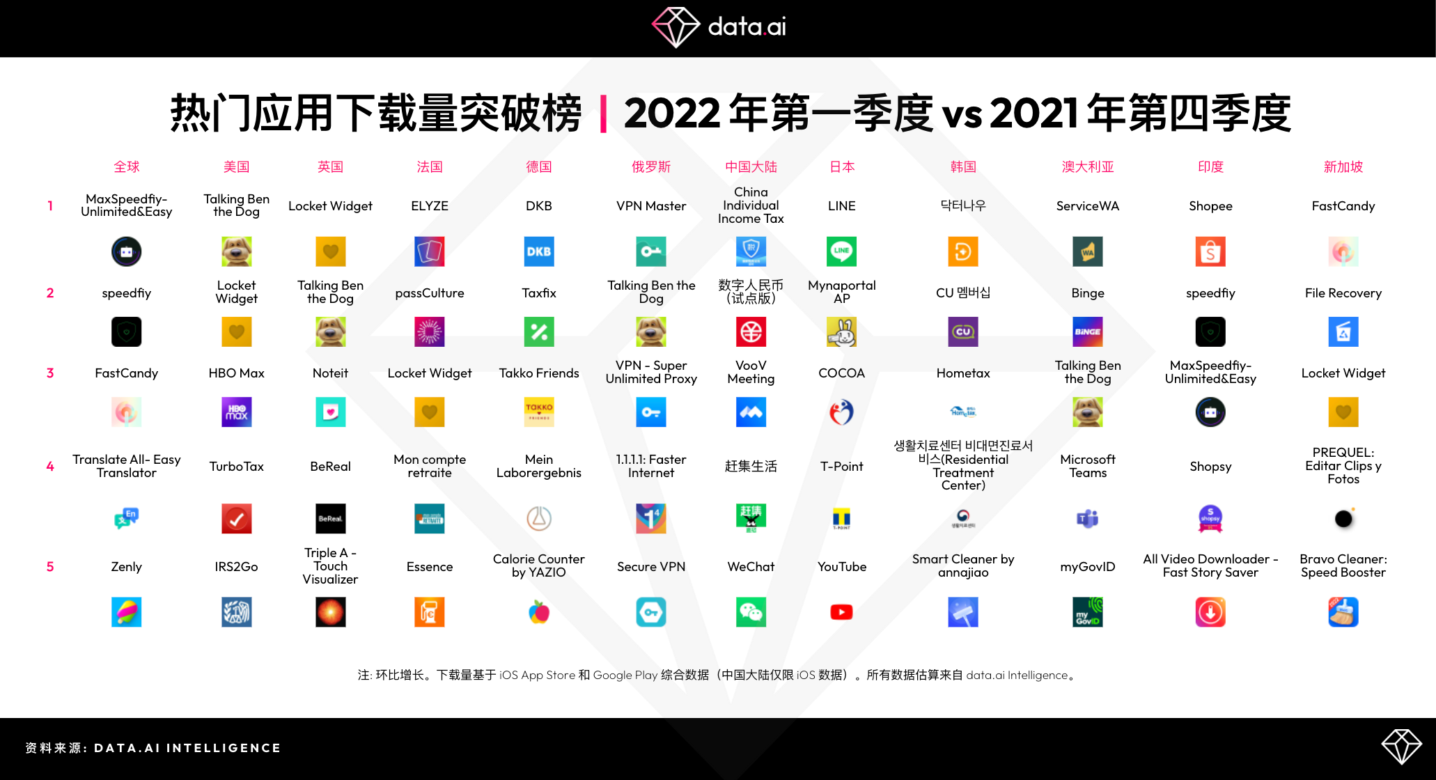 虽然这些数字自运用商场诞生以来就一直在上升,但毫无疑问,新冠疫情及其随后的封闭和坚持交际间隔方针加快了用户从“传统”媒体向运用的搬迁。data.ai 数据显现,在前十大商场中,2022 年榜首季度中的移动运用运用时长比 2019 年增加了 20%。