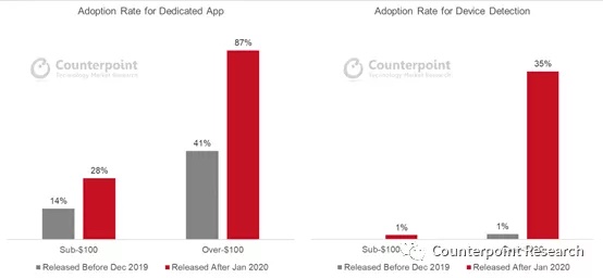 除了自动降噪外,其他的差异化功用也变得越来越重要,其中就包含厂商为TWS专门开发的App。因为这些App为用户供给了沉溺式的文娱体会,装备这项功用TWS产品也在逐步添加。在包含在100美元以下和100美元以上价格段的商场中,选用定制App的产品简直添加了2倍。顾客期望经过均衡器来手动设置TWS,以习惯个人音乐偏好并最大极限地进步音质,因此在购买TWS时,是否装备专门App也是顾客优先考虑的事项之一。设备勘探和经过App定位TWS也是一些受欢迎的功用。在2019年12月之前发布的机型中,装备上述功用的TWS产品并不多。但在2020年1月之后发布的机型中,这些功用的选用率明显添加。