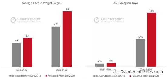 在100美元以上价格段的商场,自动降噪(ANC)功用的重要性一直在不断进步。在2020年之后,在100美金以上的机型中,超越72%的TWS产品装备了自动降噪的功用。但是,在100美元以下的机型中,因为技能和预算的要素,自动降噪功用的选用率较此前并没有太多的改变。跟着自动降噪日益成为一种常见的功用,咱们能够预期未来会有更多OEM厂商会给各自旗下TWS产品装备自动降噪。