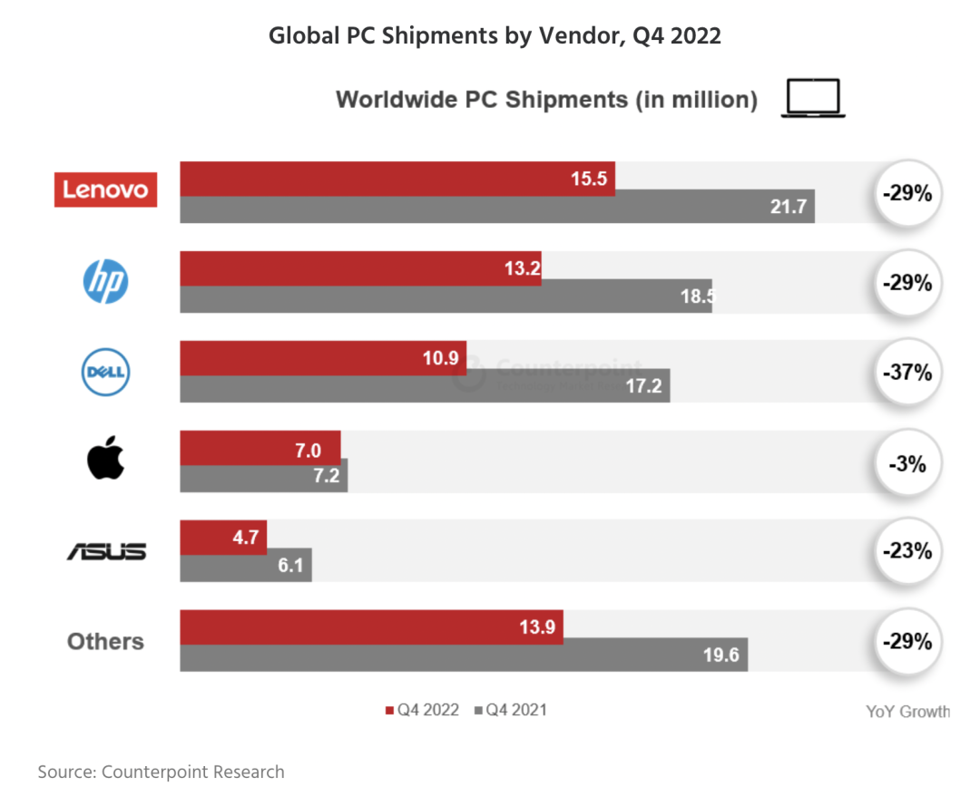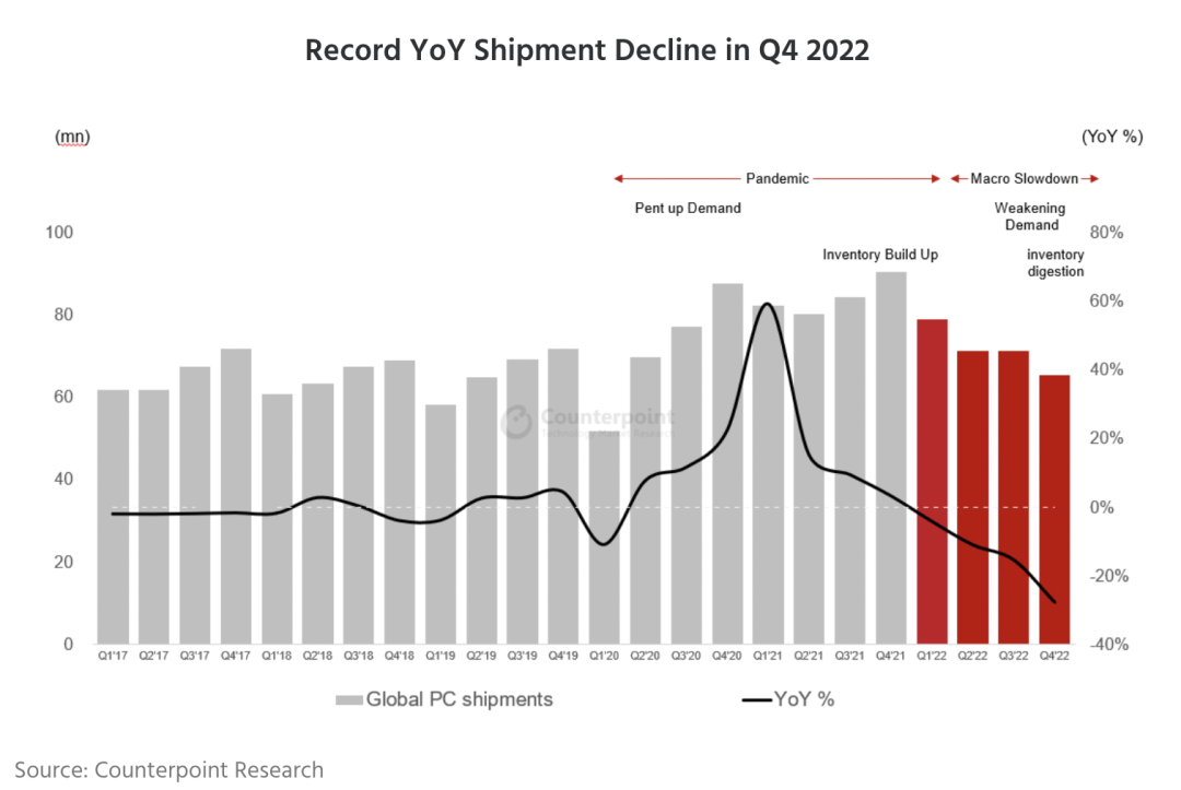 2022 年第四季度全球 PC 出货量年同比跌幅创历史新低